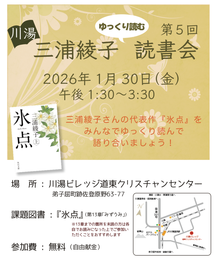 三浦綾子文学にハマっている方、興味のある方、その他どなたでも気軽にご参加いただけます!